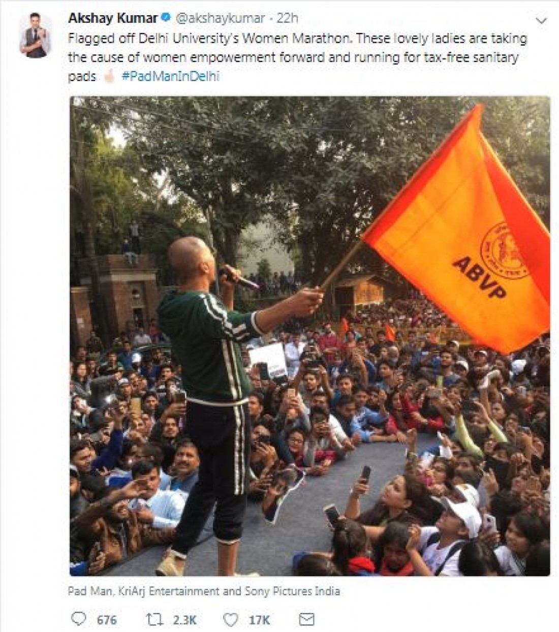 बलीउड अभिनेता अक्षय कुमार ट्रोलको सिकार भएका छन् । गत सोमबार अक्षय प्याड म्यानको प्रमोसन गर्नका लागी दिल्ली युनीभरसीटी गएका थिए । प्रमोसन कै क्रममा उनले एक राजनीतिक दलको झन्डा बोकेको फोटो टुइट गरी 'यी लब्ली महिलाहरू 'प्याड'लाई कर रहित गर्न दौडीरहेका छन्' भनेर लेखेका थिए । तस्बिर पोस्ट भएसँगै सामाजिक सञ्जालमा अक्षयको चर्को आलोचना भएको छ । उनलाई रजनीतीको बेज्जत गरेको तथा रजनीतीबाट टाढै बस्न धेरै कमेन्टका साथसाथै सुझाब पनि आएको छ । अझै कतिले अक्षयलाई 'फ्लप म्यान'को समेत नाम दिएका छन् ।